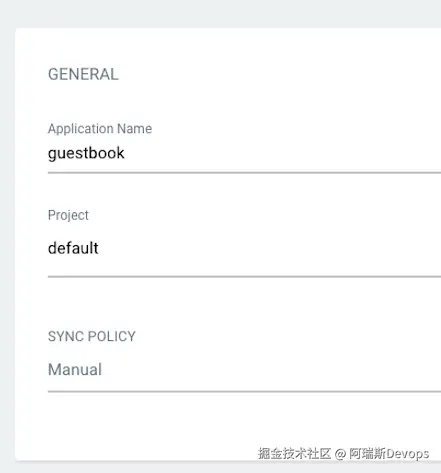 为您的应用命名guestbook,使用项目default,并将同步策略保留为Manual: