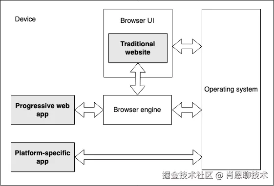 - 用户不访问时,网站不在用户的设备上存在:这意味着网站不像应用程序那样可以安装在用户的设备上,用户不使用时,网站不会占用设备资源;