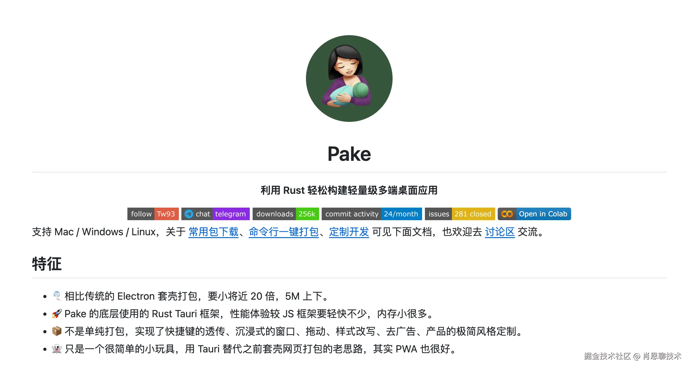 Pake是国内一个前端大佬做的开源工具,能够将任何网页转换成桌面应用程序。它支持Mac、Windows和Linux系统,并且相较于Electron打包的应用程序体积更小、速度更快。Pake提供了命令行工具来简化打包流程,并允许用户自定义开发。