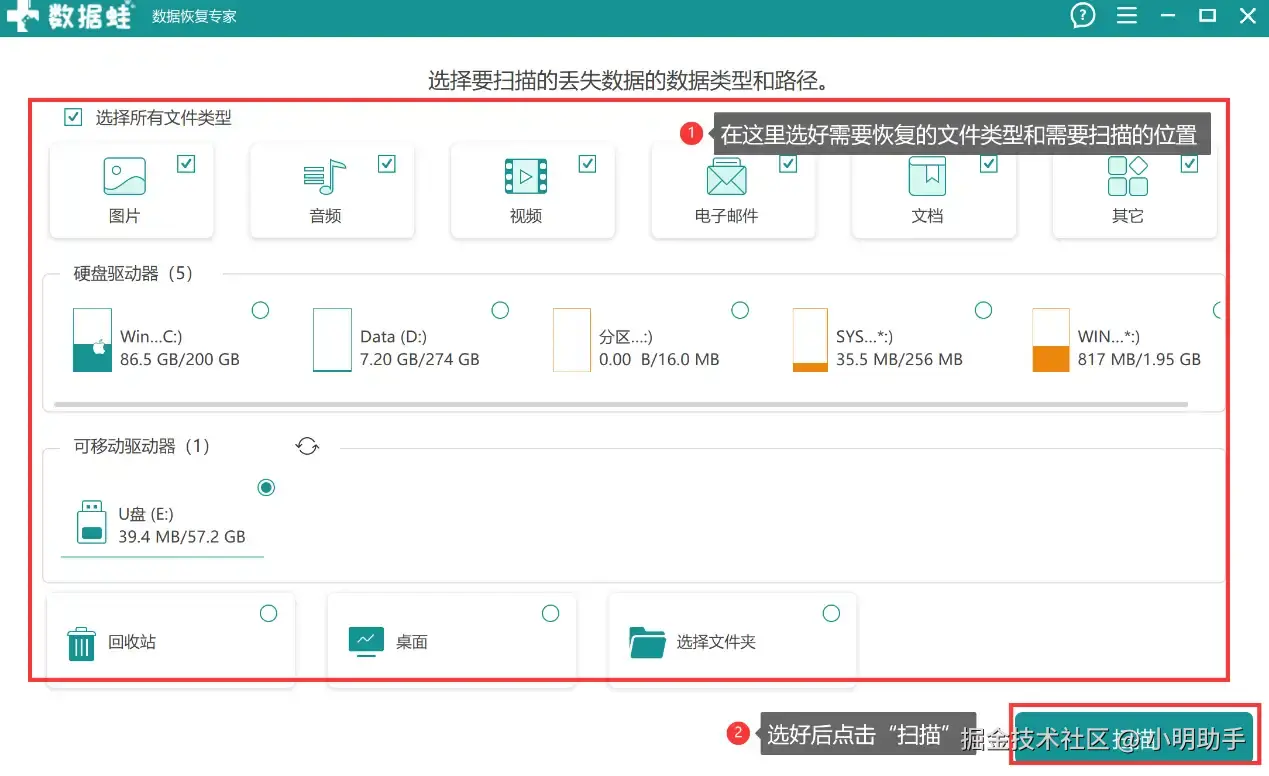 第1步: 打开软件后,选择删除文件的类型,再选择发生文件丢失的位置,选择完这两项后才点“扫描”。
