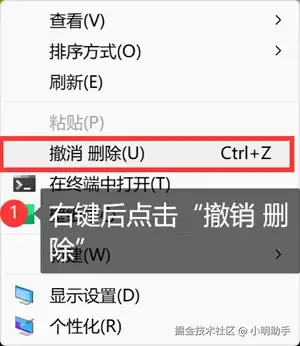 使用鼠标进行操作: 停留在误删界面上,把鼠标箭头停留在空白位置,然后右键点击“撤销 删除”;