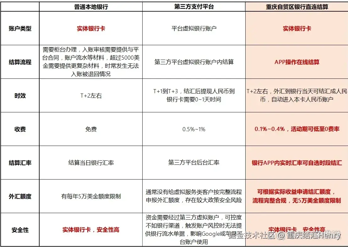 - 重庆自贸区银行没有外汇 5 万额度的限制,一类实体储蓄卡不存在关联封号的风险。