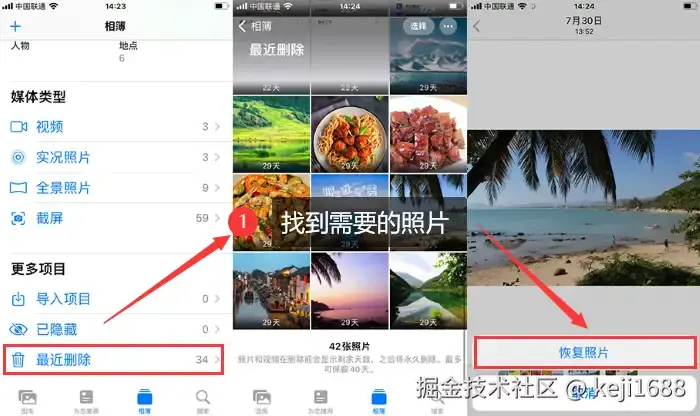 步骤2:在 【最近删除】 相册中,找到你需要恢复的照片,点击选择,然后点击屏幕右下角的 【恢复照片】 按钮即可。