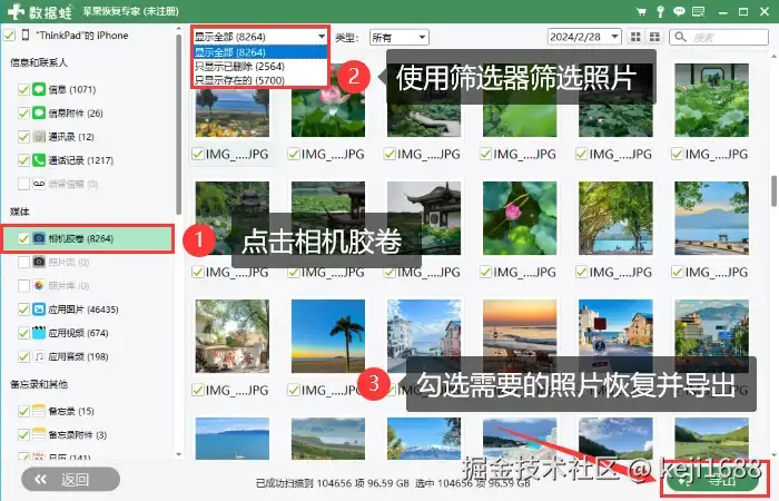 步骤2:扫描结束后,点击 【相机胶卷】 选项,并可以使用筛选器选择照片,勾选需要的照片进行恢复并导出到电脑指定位置上。