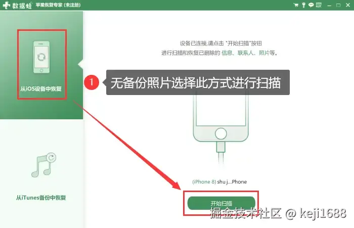 步骤1:将苹果手机通过数据线连接到电脑上,打开苹果恢复专家,当显示手机成功连接到电脑上后,选择正确的扫描方式并点击 【开始扫描】 。