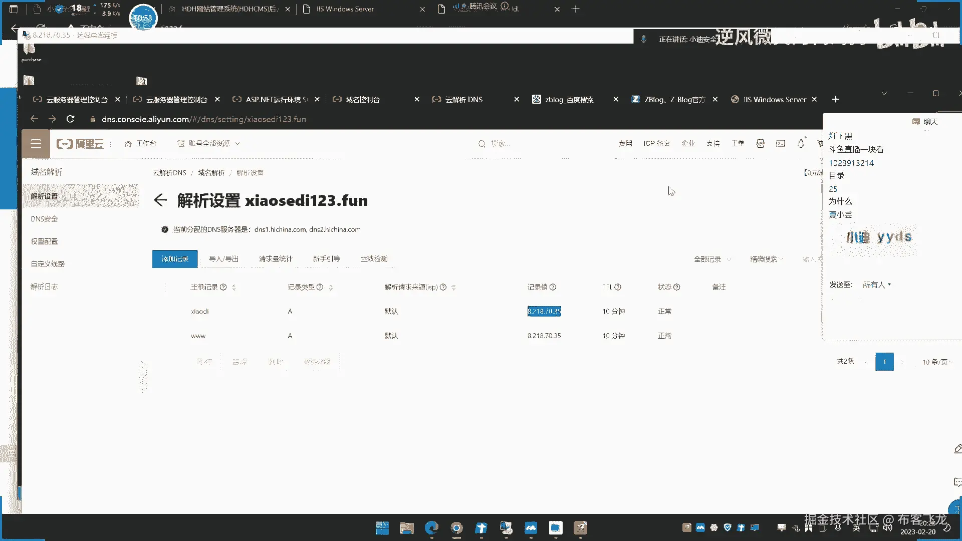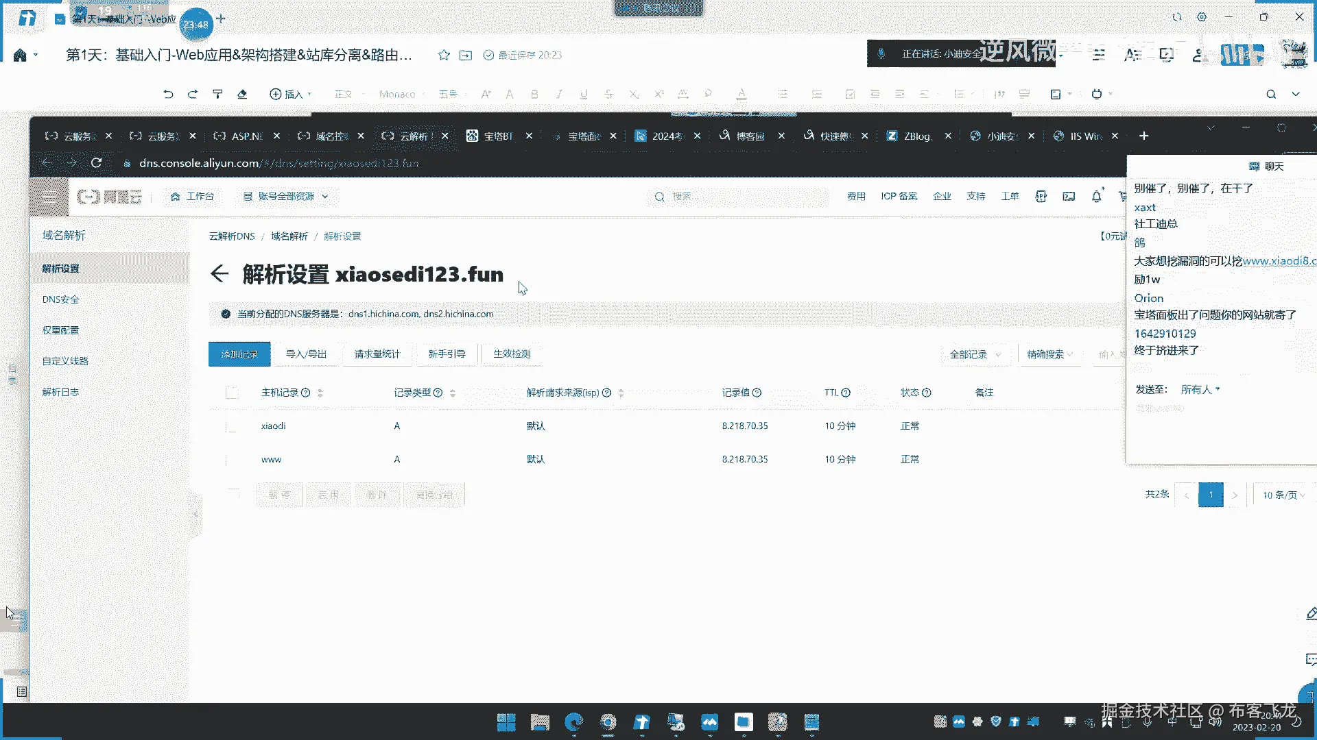 先保持默认没有的状态,点击添加记录A记录,将域名指向一个IP,非例子选择,然后呢前面写个3W点,意思就是说它的域名是小迪一三连方,3W就代表之前人家是3W这个意思,然后指向IP地址,把指向哪里呢。
