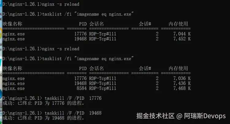 重新加载一次配置就会单独生成一个进程,需要手动kill掉原来的进程