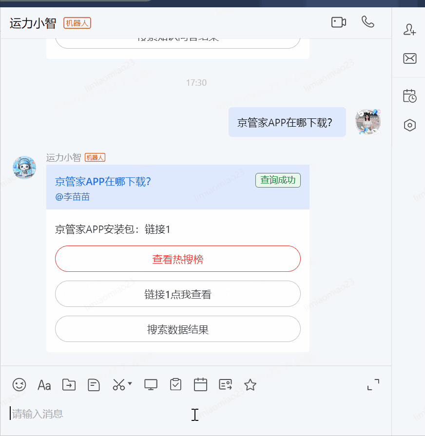 • 智能主动预警:除了支持个人用户以及群聊用户主动搜索进行对话以外,还支持面向m端/pc端指定用户、特定群组,主动发送单聊消息、语音信息(例如定时或固定周期发送报告、识别到的异常信息等)进行提示预警,让问题主动、及时的触达主责用户。