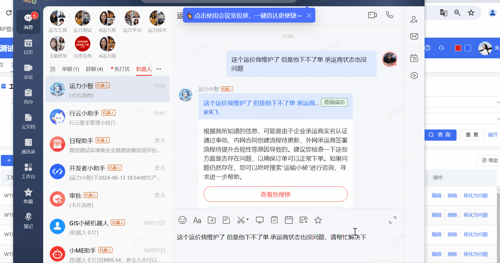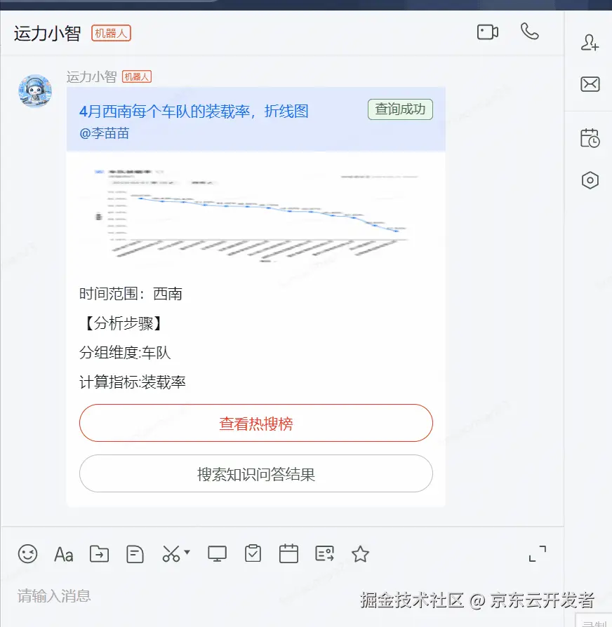 基于大模型搭建运力智能机器人“运力小智”,定位是一个集知识问答、数据分析功能于一体的便携式知识百科信息问答平台。它以运力平台日常工作所涉及的内容为核心,涵盖了业务SOP、常见系统问题、操作手册、实时类信息查询(天气、安全)、报表查询、数据分析等多项内容,致力于帮助运力用户(内部运营岗位、承运商、司机)更便捷、高效的获取有效信息,并通过大模型能力持续赋能,为用户提供个性化的推荐和良好的用户体验,减少用户获取知识的成本以及减少异常等问题的管理难度。