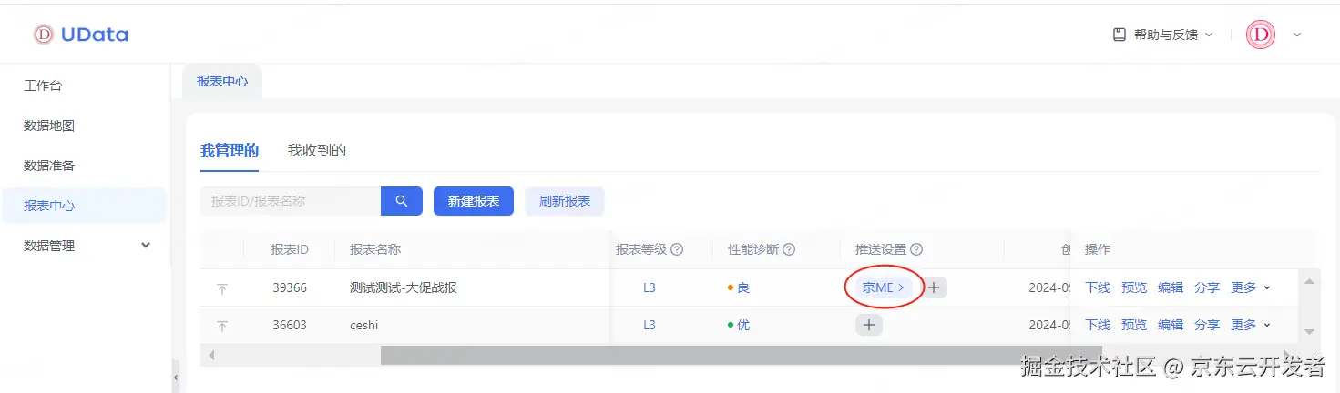 1、Udata报表中心,先选择要推送的报表,选择右边的推送设置选择【京ME】-选择想要的推送方式