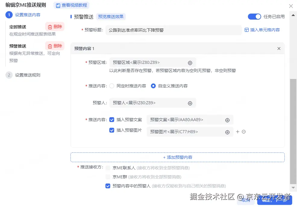 2.预警推送:基于业务自身数据看板,根据所关注的达成率/指标值等进行规则的灵活设置,可以自动触达到对应责任人,提升数据分析和决策效率;
