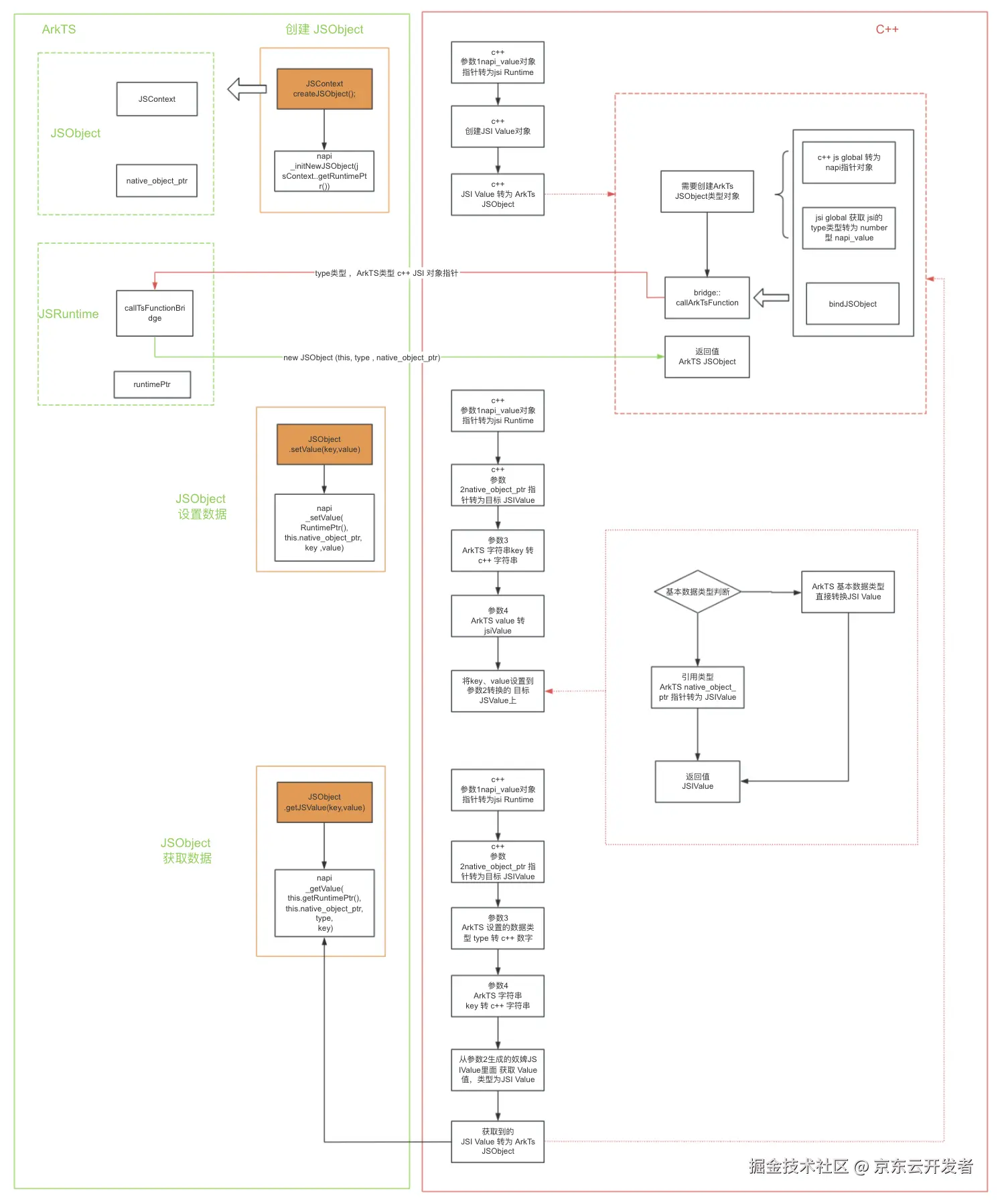 通过JSRuntime 发起接口的调用,通过napi,根据对象类型在C++侧创建对象的JSValue对象及象指针引用, 并将引用指针绑定至ArkTS对象,完成对象的创建。