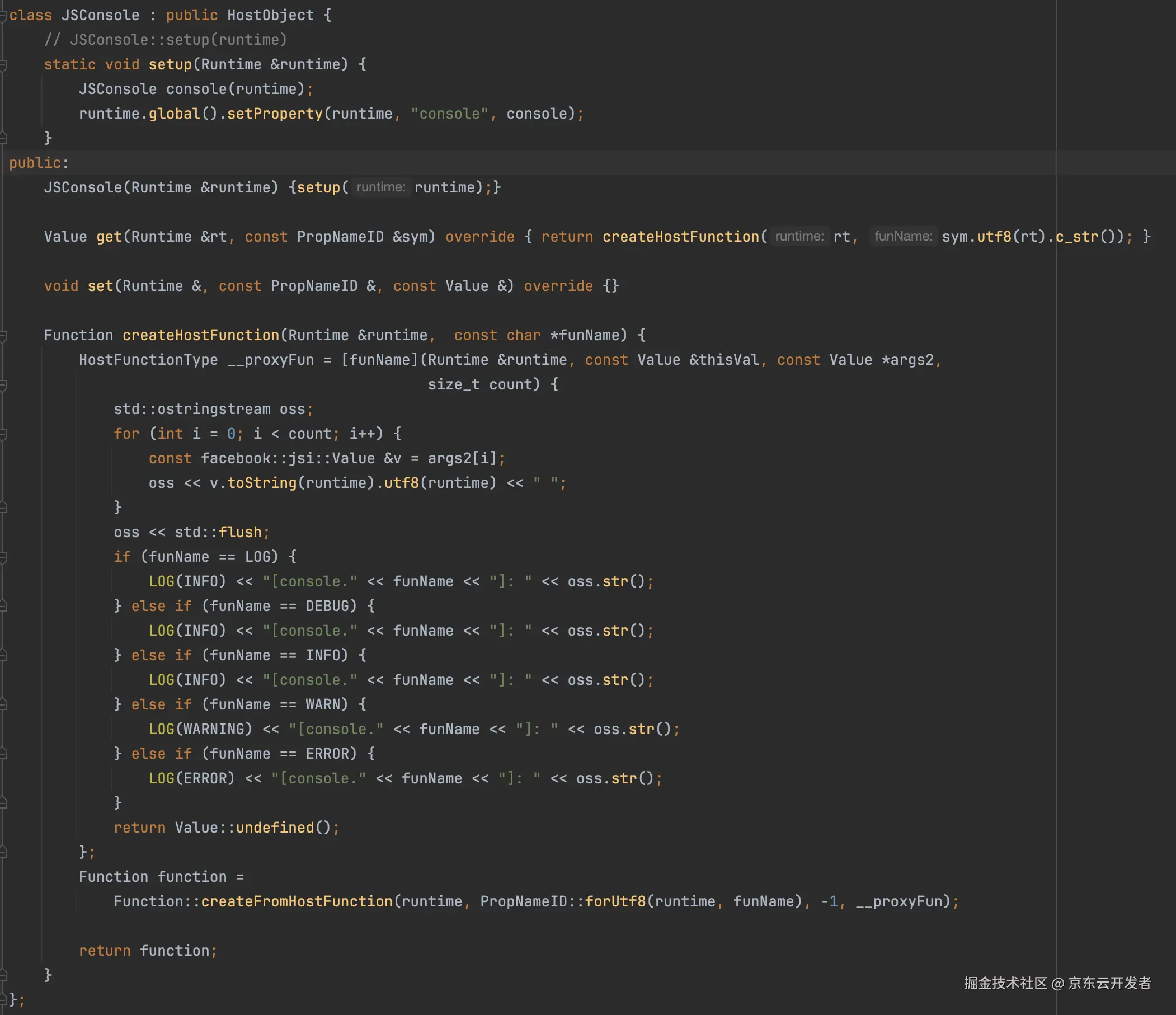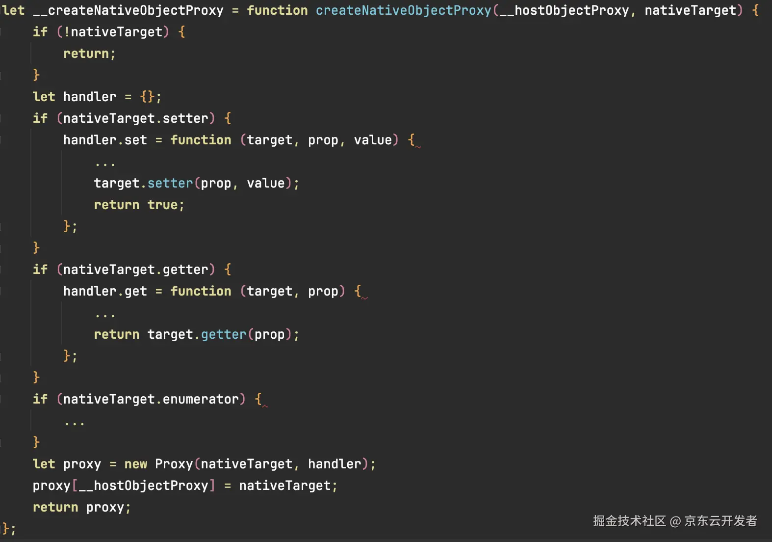 HarmonyOS提供的JSVM API最初仅支持代理函数的创建, 而我们需要是创建代理对象,对象中可以有任意方法,仅通过代理函数方式无法满足任意方法的需求,为此通过在JS中注入代理对象脚本实现,通过Proxy代理的方式,将get、set等代理对象的方法通过代理函数的方式返回,这种情况下,我们的函数数量就被简化成了get、set及一些固定的方法。 通过这些方法做代理转接,调用到C++对象方法,借助JSI::Value的包装,将具体结果返回。