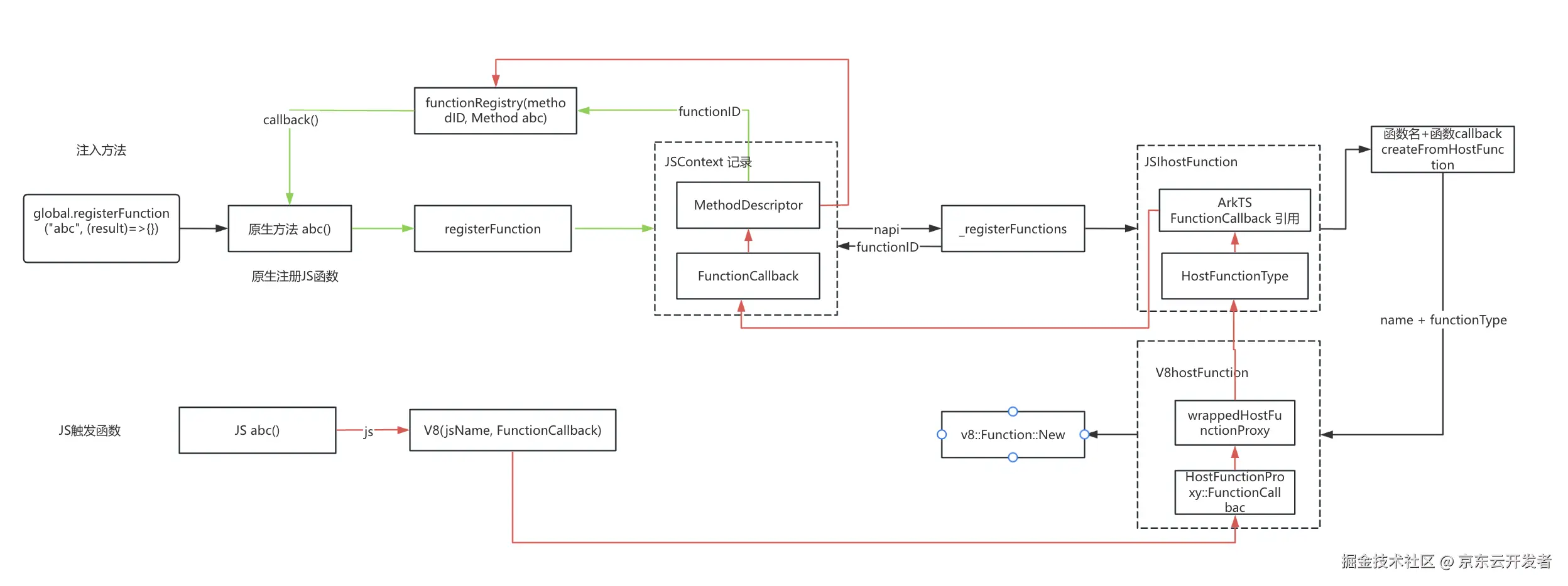 将ArkTs的方法 和 目标注册对象指针 生成MethodDescriptor方法描述对象, 通过functionID将对象存储在当前JSContext环境中。 通过napi 发起在C++侧代理函数HostFunction的创建,并绑定ArkTs的方法的引用。 进入到JSI内部,创建方法代理HostFunctionProxy 对象,绑定代理方法HostFunction及守护函数Finalizer, v8::External 将HostFunctionProxy与 JS环境对象(V8对象) 关联起来,生成V8 Function , 此时V8函数会与HostFunctionProxy生命周期绑定。 简单来说相当于ArkTS callback,传递至C++,C++创建JSI Callback并绑定ArkTS callback, JSI Callback 设置到HostFunctionProxy中,HostFunctionProxy 通过 v8::External与 JS环境绑定。
