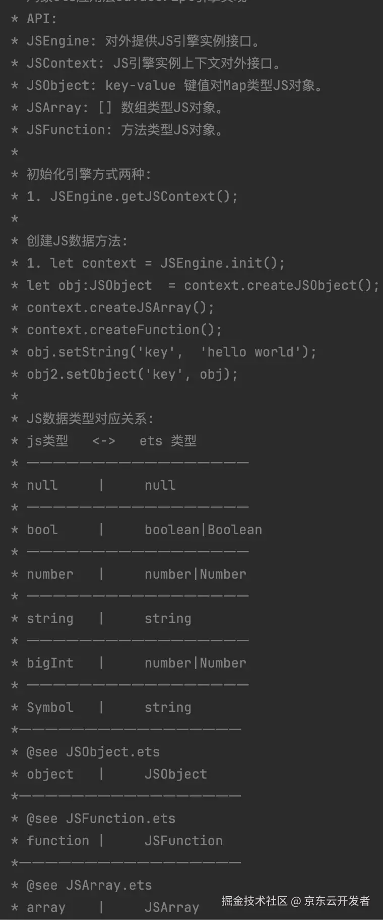 4、虚拟机对象的定义及封装:根据JS数据类型,定义ArkTS数据结构,包括基本数据类型、JSObject、JSArray、JSFunction。ArkTS侧 类型对象持有C++ JSIValue 对象指针,当执行具体能力时,通过napi 传递指针,完成具体功能的调用。 简单来说,相当于ArkTS JS对象代理C++ 虚拟机数据对象。
