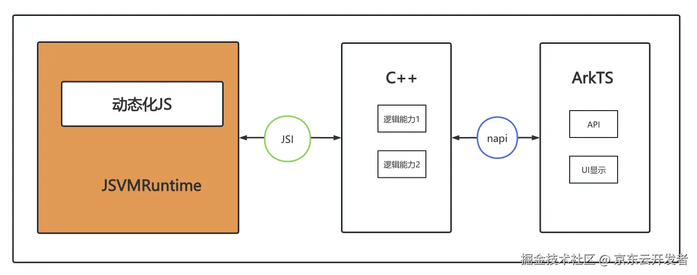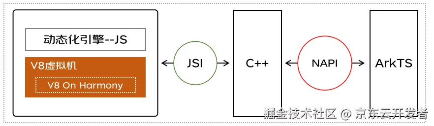 ArkTs2V8 架构借鉴了Android J2V8(动态化-J2V8文章中讲述了具体原理及实践)的实现原理。 J2V8为针对V8的 Java实现,采用最直接的方式在Java中访问V8原始值,因此具备较高的性能。 在HarmonyOS中,采用V8作为JS引擎, JSI作为通信层完成设计。