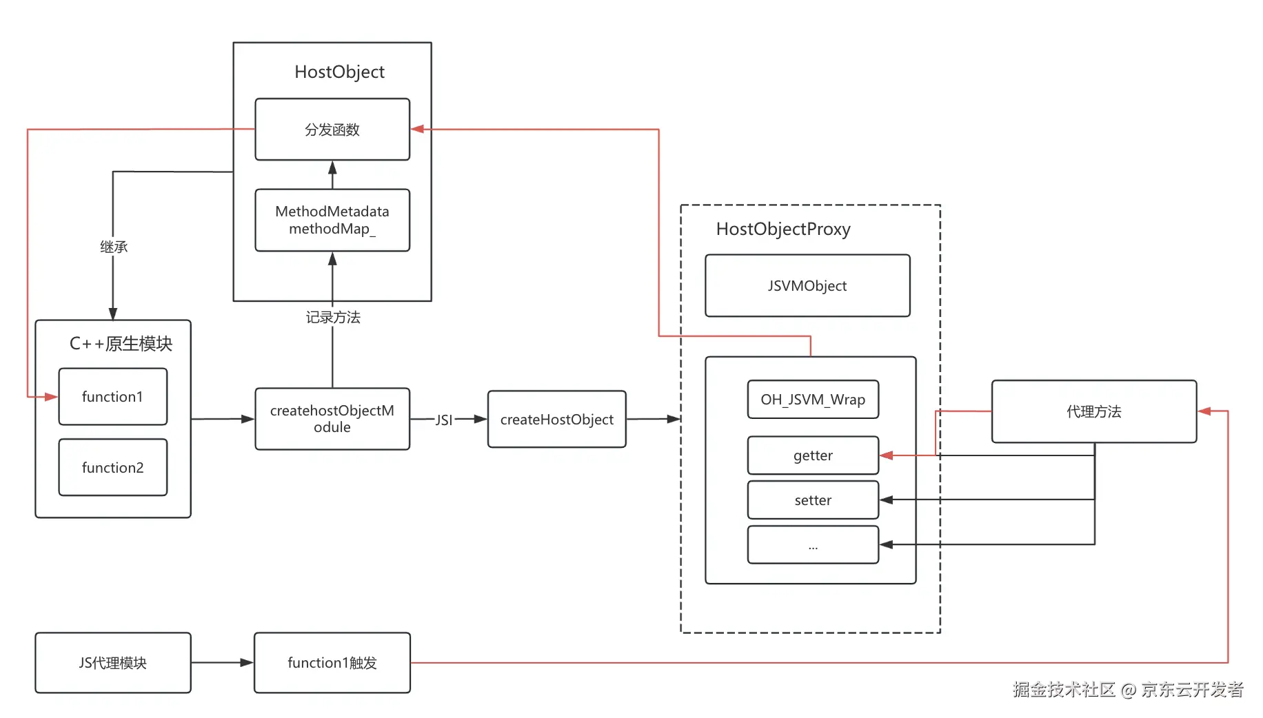 HostObject 是JS对象,提供与原生直接通信的方式。 相当于 native 在 JS的代理对象,双向映射,原生模块直接与JS 同步或异步交互, 在一些功能实现上可以缩短流程链路, 在JS中可直接调用C++的对象。 在动态化中, 模块的实现采用的就是HostObject能力, 框架层实现模块代理对象及桥通信层面的双向通信过程。 比如登录模块,在ArkTS侧封装模块的API,通过C侧的HostObject映射,可以在JS中直接调用登录模块的登录,退出登录等能力。 HostObject的实现,虽然在框架层面相比于乔通道的方式更加复杂,但对于复杂逻辑流程和交互链路, 基础开发可以更注重于功能逻辑。