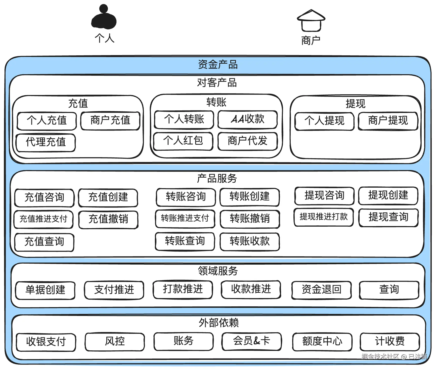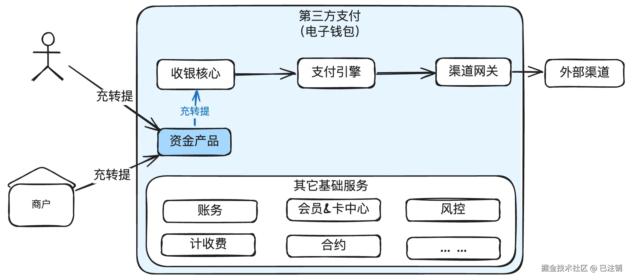 资金产品处理用户的资金流动,包括充值、转账、提现等操作,简称“充转提”。既有面向个人用户的,也有面向商户的。