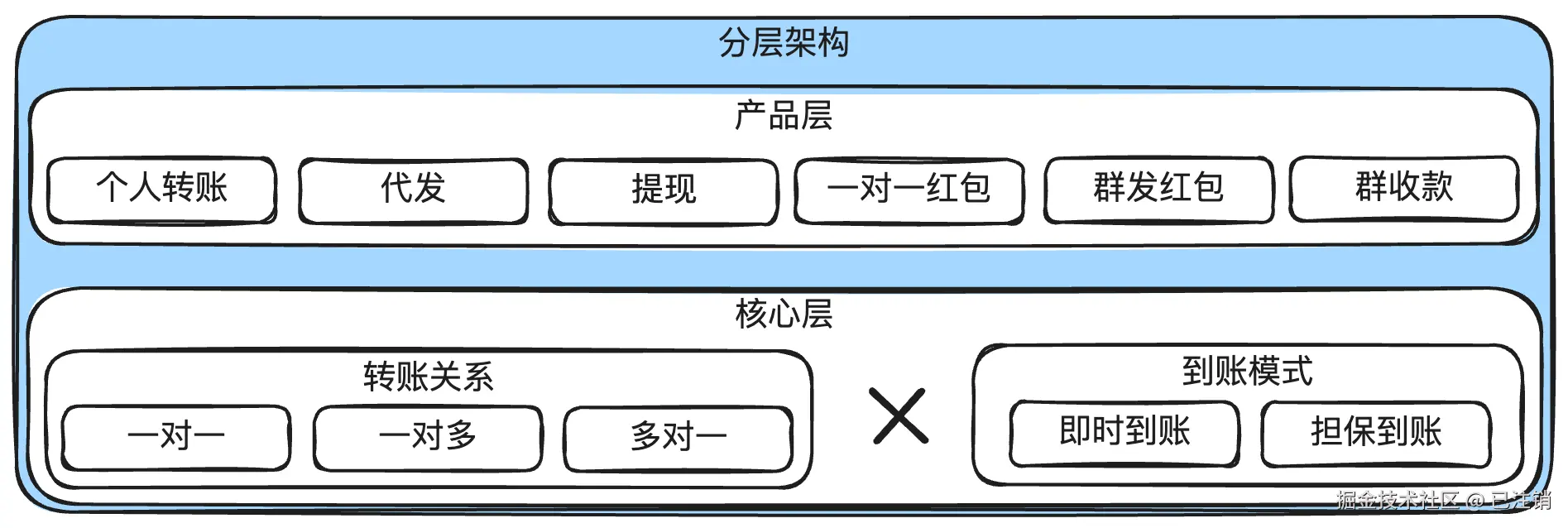 - 对客产品可以封装成多种形式,比如红包,AA收款都可以由转账来封装。