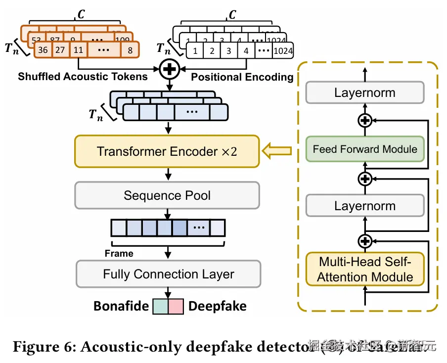 SafeEar 框架的伪造音频检测后端设计了一种仅基于声学输入的 Transformer-based 分类器,采用正弦、余弦函数交替形式对语音信号在时域和频域上进行位置编码。