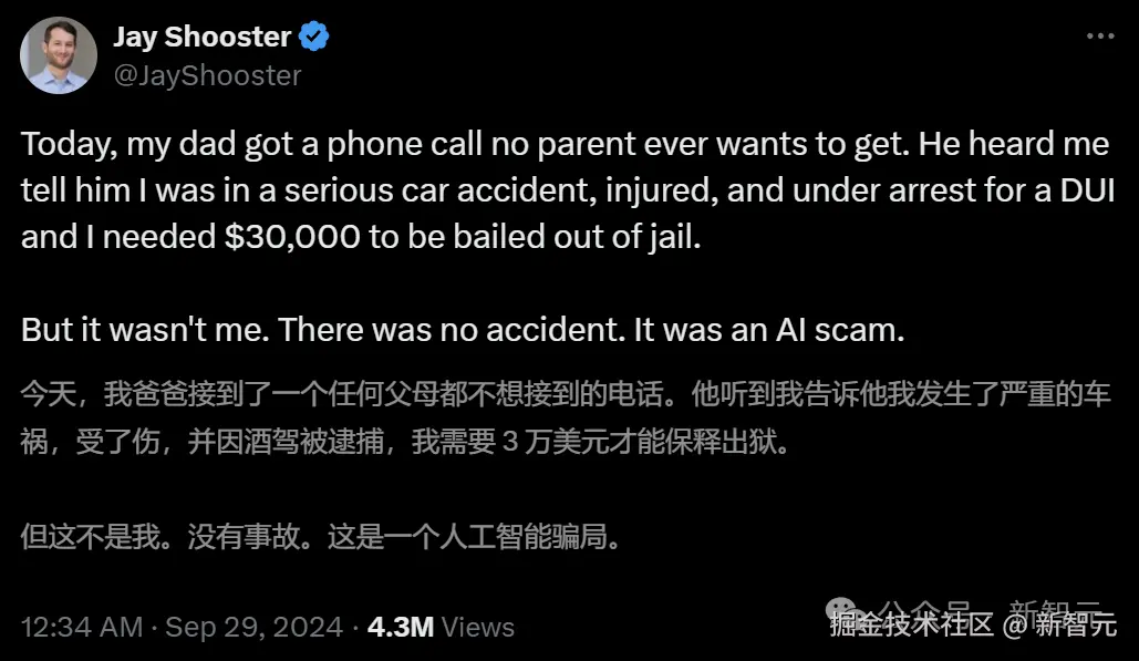 诈骗者利用 AI 克隆了 Shooster 声音,然后给他的父亲拨去电话:您孩子因酒驾开车被捕,需 3 万美元保释出狱。