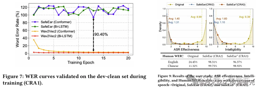 同时,实验还证明攻击者无法基于该声学信息恢复语音内容,基于人耳与机器识别方法的单词错误率(WER)均高于 93.93%。