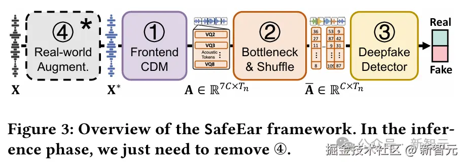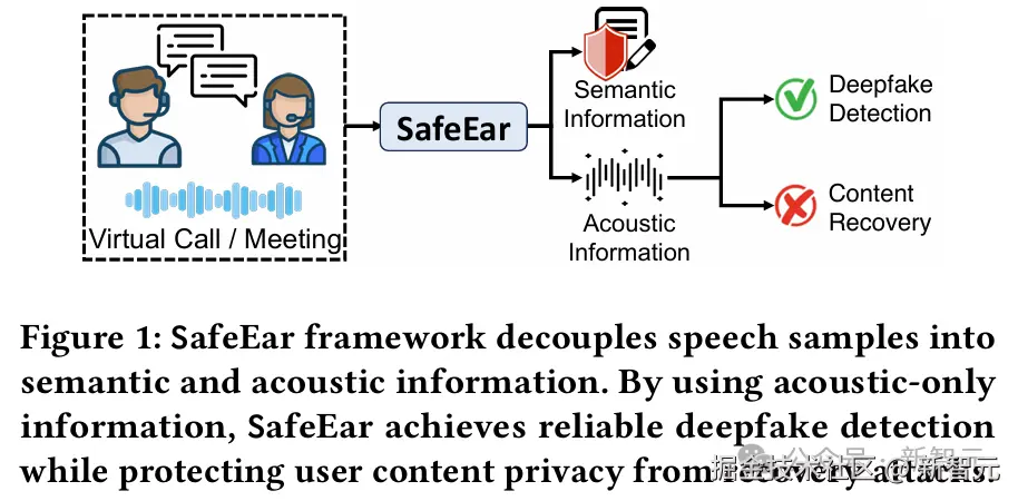 SafeEar 的核心思路是,设计基于神经音频编解码器(Neural Audio Codec)的解耦模型,该模型能够将语音的声学信息与语义信息分离,并且仅利用声学信息进行伪造检测,从而实现了内容隐私保护的语音伪造检测。