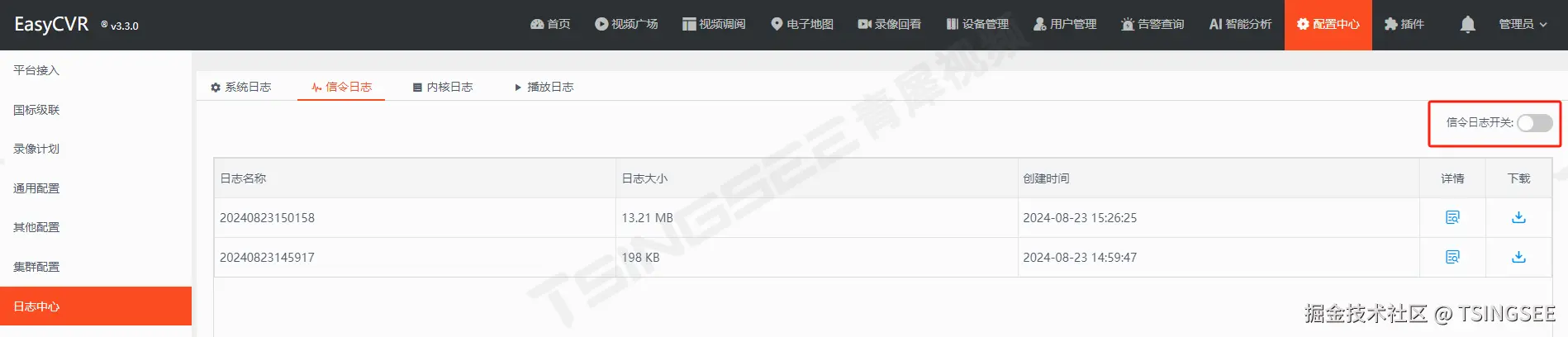 建议:在EasyCVR平台运行中,会占用空间的一般是信令日志、快照、云端录像文件。若用户不需要日志,可以在平台内关闭。在平台【配置中心】-【日志中心】中,关闭信令日志开关即可,如下所示: