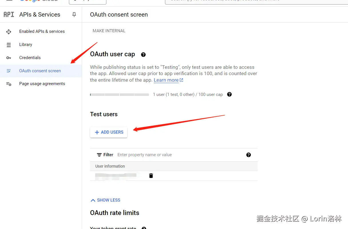- 由于程序尚未发布无法访问,需要把当前谷歌账号加入到测试用户中。