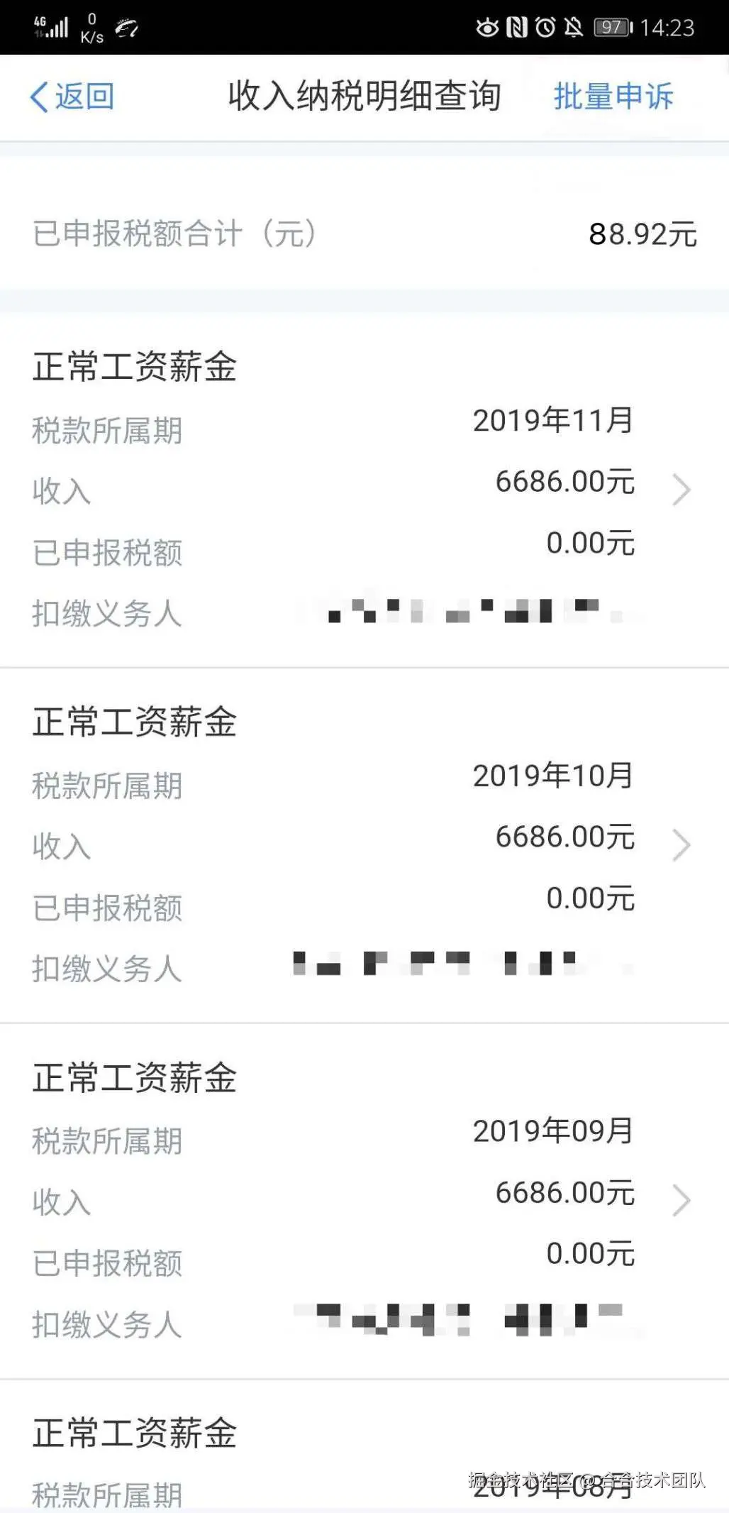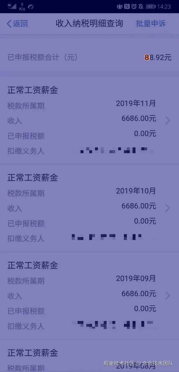 如下图(个人所得税APP截图)可见,TextIn图像篡改检测能够作为辅助手段,协助人事在背调、审核过程中查实相关候选人信息,提高业务效率,使调查更为可靠。