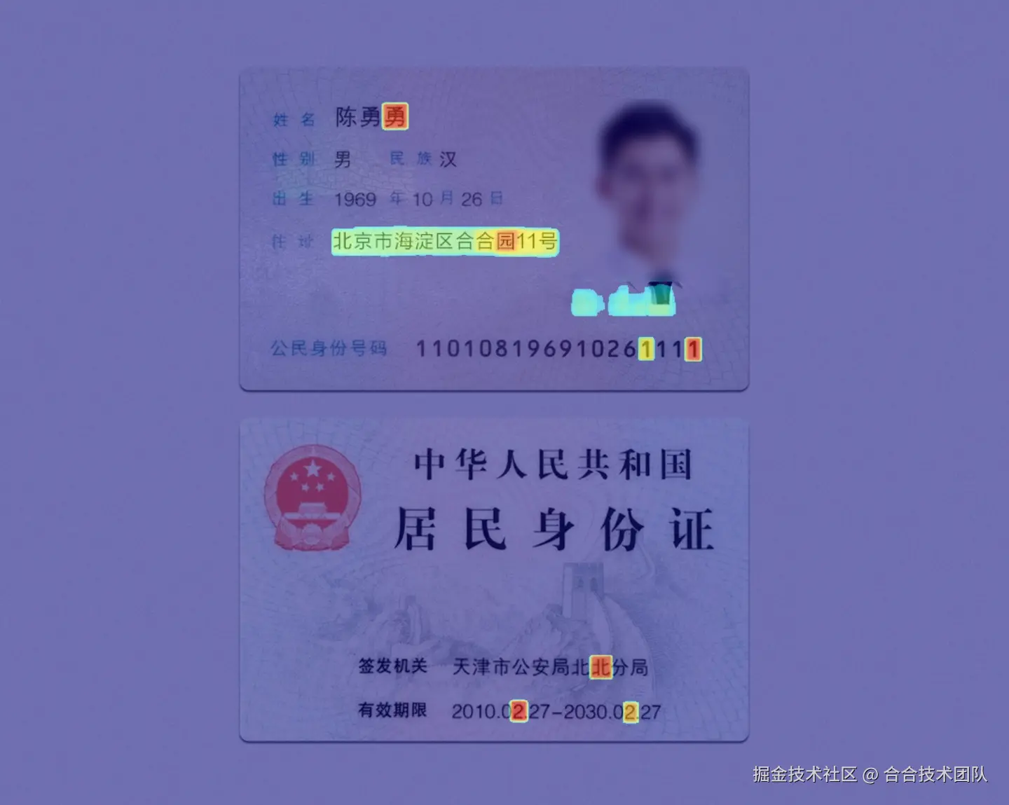对身份证等卡证文件,TextIn图像篡改检测能够实现稳定的高检出率,并显示篡改区域与篡改置信度,助力反欺诈审查。