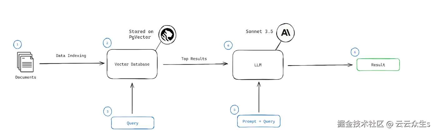 - LLM:将组合的提示和查询传递给 LLM,该 LLM 会使用来自向量搜索的上下文信息和最佳结果,生成最终输出或响应。