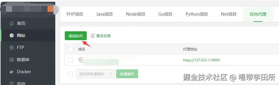 - 回到宝塔面板,添加反向代理,顺便一提下面那个是Web服务的域名。