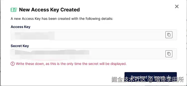 记住访问键其后续不可更改,用于上传图片,可下载保存。忘记了也没多大事,重新创建一个就是了。