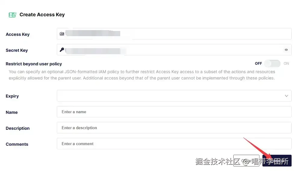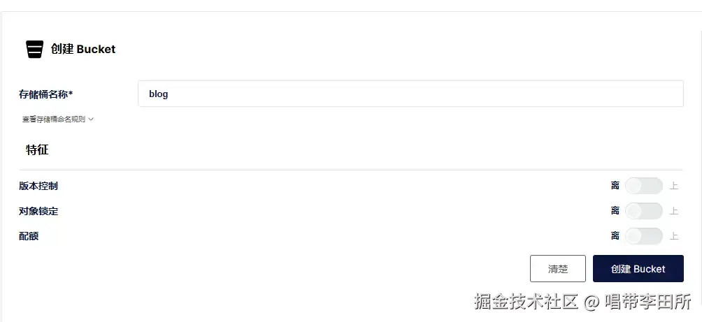 对象桶名称会显示在图片的Url中,建议精简点,完成点击右下角创建。个人使用图床其它选项不用管,想了解的可自行搜索资料或者去MinIO官网查阅。