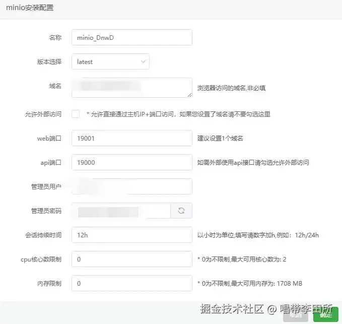 - 域名:这是提供Web服务器的域名,填入自己的域名,例如域名是myname.com,填入即可。建议设置二级域名,例如myminio.myname.com来实现域名复用性。
