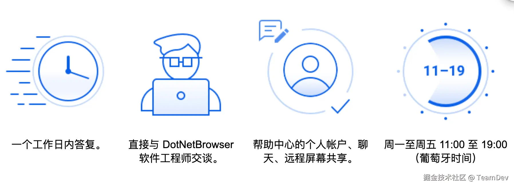 我们的支持工程师将与您联系并就产品的使用进行咨询,提供专家建议,回答您关于 DotNetBrowser 可能性的所有问题,并协助解决不同的问题。