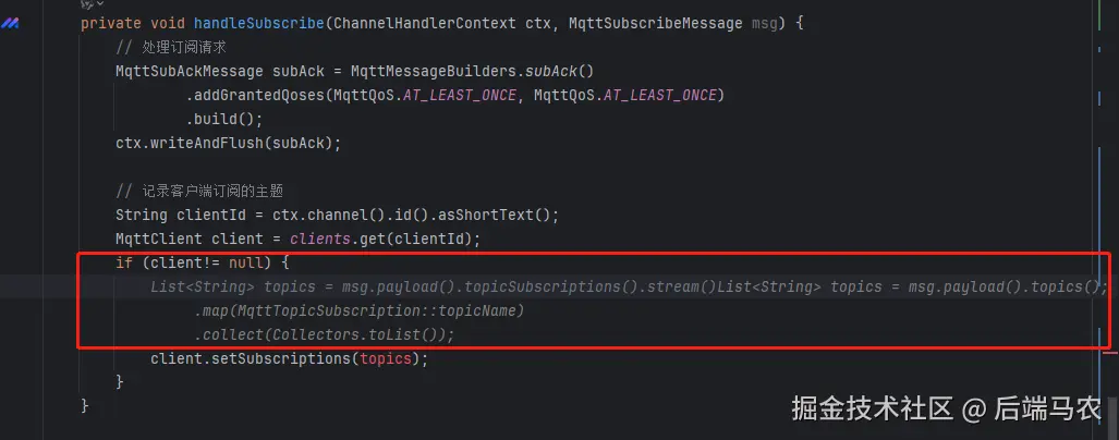 在这个修改后的代码中,我们添加了一个 clients 静态 Map 来存储客户端信息,并且在 handleSubscribe 方法中记录了客户端订阅的主题。当客户端订阅或取消订阅主题时,我们会更新 MqttClient 对象中的订阅信息。