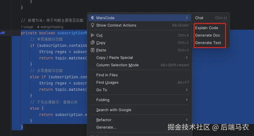 - 选中代码片段后右键,然后在快捷菜单中选择 MarsCode > Explain Code;