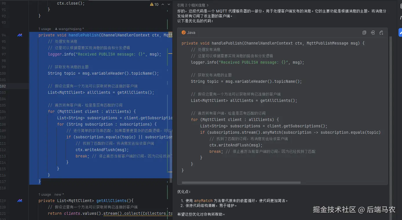 - 选中代码片段,然后在对话框中输入自然语言描述,例如 “优化选中的代码片段”。