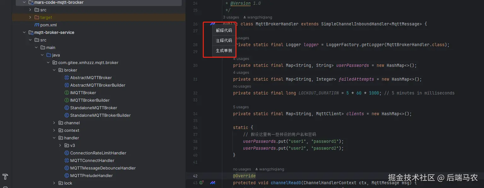 在handleConnect方法中实现客户端账号密码校验,校验通过则记录客户端信息MqttClient,如果验证失败则关闭回话,且1分钟内超过三次验证失败则锁账号5分钟