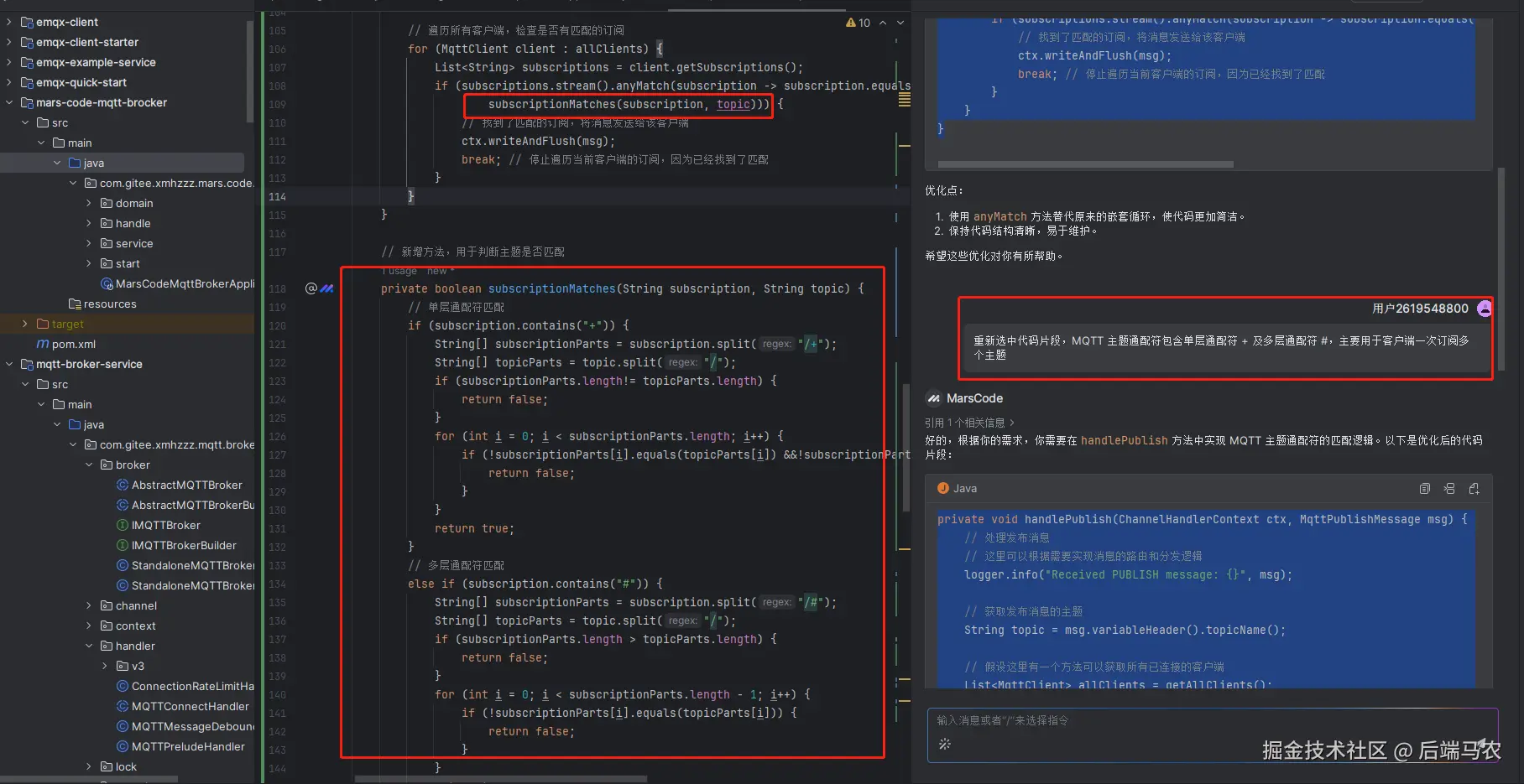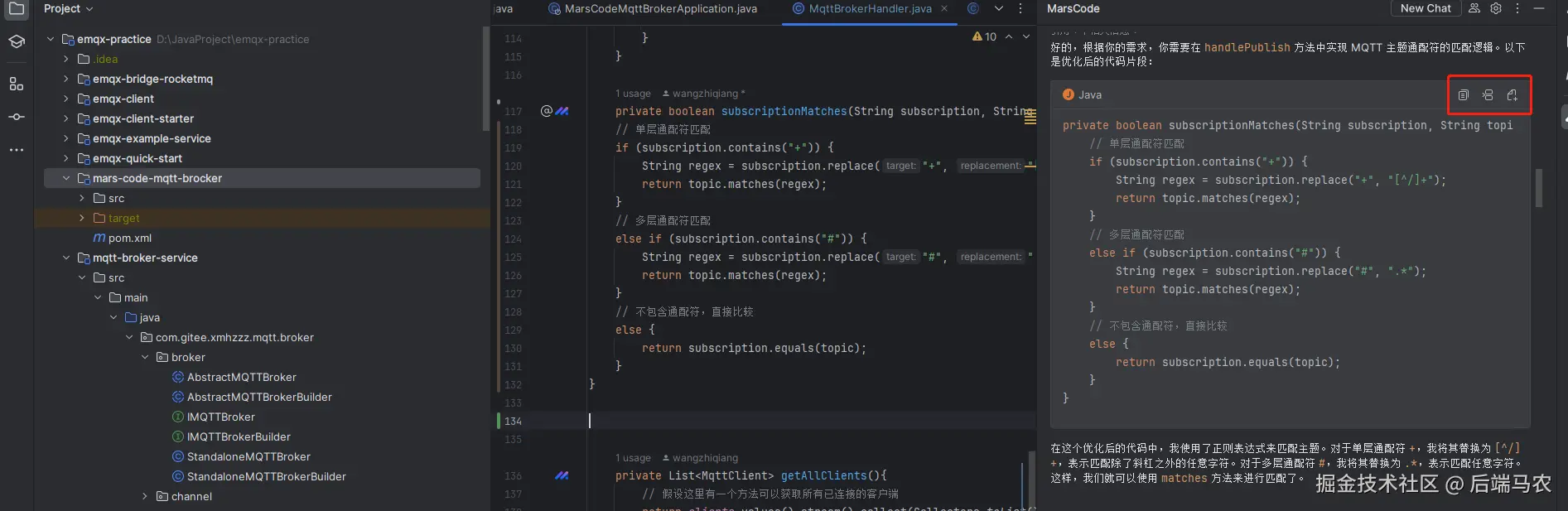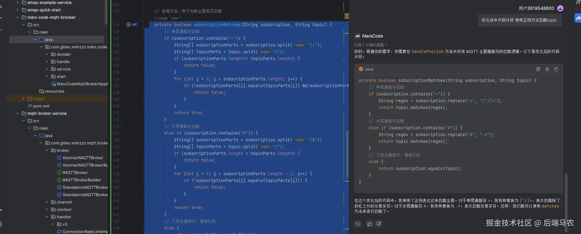 代码中的subscription.matches(topic.replaceAll("/+", "/.*"))正则表达式是无法满足MQTT的topic的。