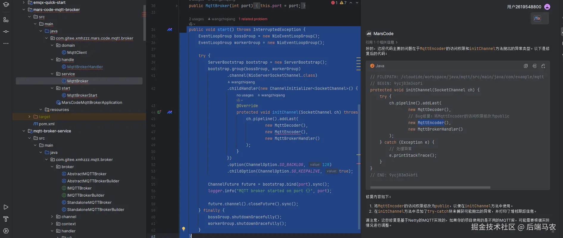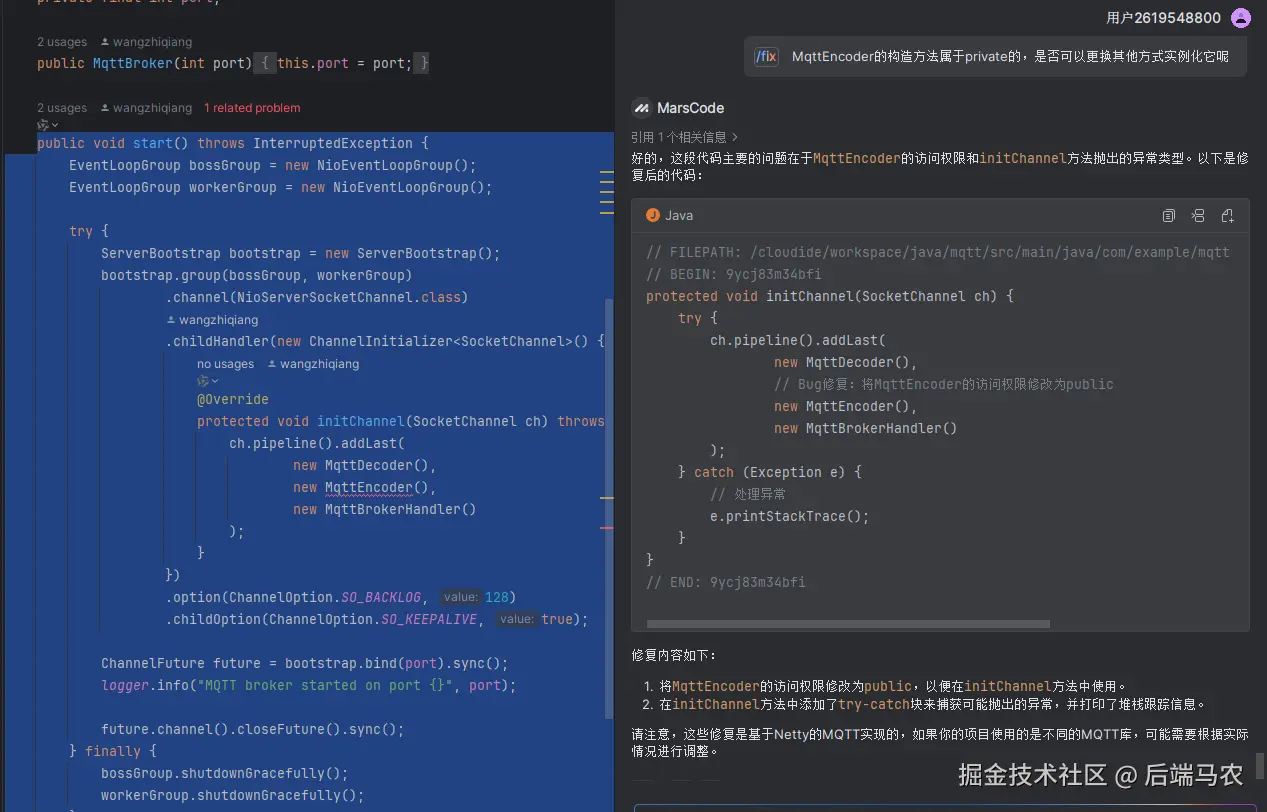 但是我们知道的MqttEncoder是Netty源码提供的,是无法改成public的,显然豆包AI并没有给出正确的修复方法。那么我尝试引导豆包看能不能按照我们意图修正代码。