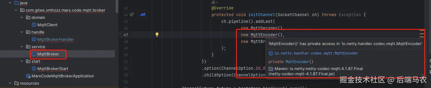 从idea给出的提示MqttEncoder的无参构造方法是私有的(private)。
