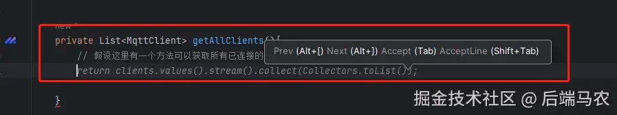 场景一:在对应代码处,敲击回车键换行。豆包 MarsCode 编程助手会阅读并理解当前代码,然后自动补全后续代码。这个场景我个人觉得比不上idea本身代码提示功能。