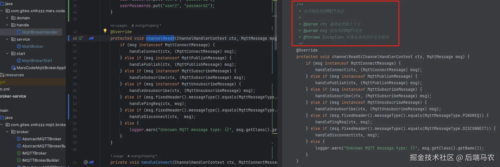 接下来,创建一个MqttBrokerHandler类来处理MQTT协议的各种报文: