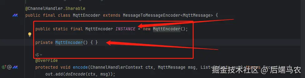进入源码也可以看出MqttEncoder的无参构造方法是私有的,但是提供一个名为 INSTANCE 的静态常量,它是 MqttEncoder 类的一个实例(单例模式)。
