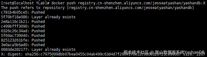 [root@localhost YLab]# docker push registry.cn-shenzhen.aliyuncs.com/jesseatyashan/yashandb:X