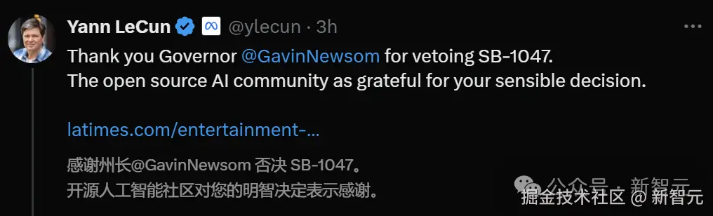 【新智元导读】喜大普奔!就在刚刚,加州州长宣布:否决加州 AI 限制法案。LeCun 李飞飞吴恩达激动地奔走相告,额手称庆。而强烈支持法案的 Bengio 和 Hinton 则对此保持沉默。OpenAI、谷歌、Meta 纷纷逃过大劫。
