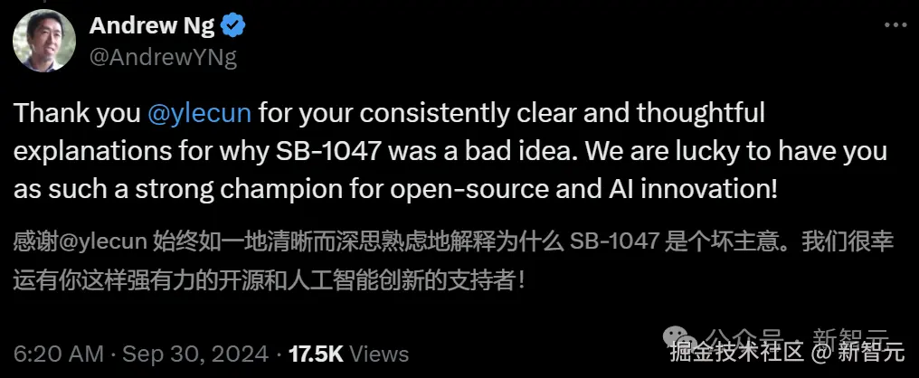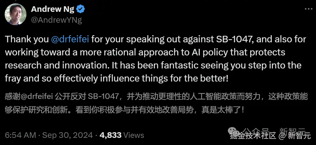 AI 泰斗吴恩达也感谢了李飞飞对于 SB-1047 的公开反对,称她的努力能推动更理性的 AI 政策,从而保护研究和创新。